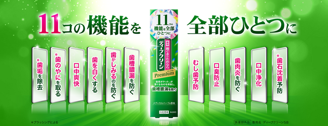 そこで「ディープクリーン」は、歯ぐきを含め口腔内悩みのトータルケア提案として、歯槽膿漏予防とともに、11コの口腔悩みに対応するプレミアム処方の『ディープクリーン プレミアム 薬用ハミガキ【医薬部外品】』を発売いたします。「ディープクリーン」ブランド共通の、歯周ポケット※2 が深くなるのを抑制し歯槽膿漏を防ぐ効果に加え、歯がしみるのを防ぐ効果や口臭防止など、11コの機能がひとつになりました。