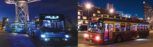 連節バス「BAYSIDE BLUE(ベイサイドブルー)」と観光スポット周遊バス「あかいくつ」の車内を特別イルミネーション装飾し、ライトアップして運行します。