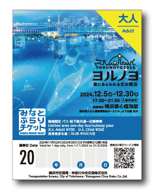 あわせて、横浜観光を便利でお得に楽しめる1日乗車券「みなとぶらりチケット」を、日本最大級のイルミネーションイベント「夜にあらわれる光の横浜〈ヨルノヨ2024〉」とタイアップした特別デザインにて販売します。