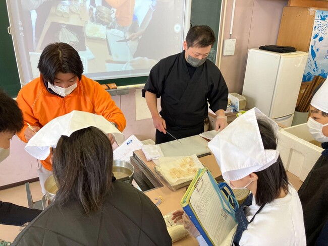 2月16日(木)は、ついに「実食」の日です。地元料理人の中瀬さんに協力いただき、愛媛から取り寄せたプロが育てた養殖の生きたヒラメを捌いてもらい、食べました。捌くときに可哀想な気持ちにならないですか?という質問に対して、可哀想ということよりも「食べてもらう人に、どうやって美味しく食べてもらいたいかを考える」というお話をされ、児童たちは命を大切に扱う料理人の気持ちを直に感じたようでした。これまでに地元の竹島水族館の小林館長や養殖業者、水産業者、料理人から、どういった想いで仕事に向き合っているかお話を聞いて知ったことで、食卓に食べ物が届くまでに関わってくれる人たちへの感謝の気持ちを改めて実感することができました。
