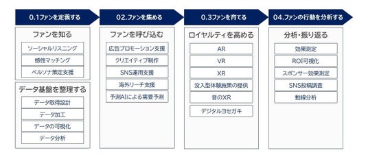 AIを用いた、ファンの反応を予測する分析ツール(予測分析AI「Prediction One」)や、消費者の感性や価値観を中心とした多角的なデータ分析(感性AI「SENZAI」 (*2))を提供します。