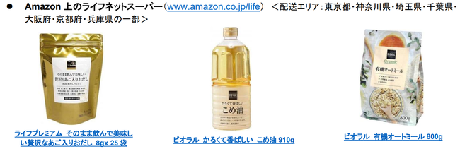 Amazonは、Amazon プライム会員向けサービスとして、東京・神奈川・千葉の一部エリアにおいて「Amazonフレッシュ」( http://www.amazon.co.jp/fresh )を、食品スーパー ライフとの協業により、東京・神奈川・埼玉・千葉・大阪・京都・兵庫の一部エリアにおいてライフネットスーパー( http://www.amazon.co.jp/life )を、スーパーマーケットバローとの協業により、愛知の一部エリアにおいてバローネットスーパー( http://www.amazon.co.jp/valor )を、スーパーマーケット成城石井との協業により、東京・神奈川の一部エリアにおいて成城石井ネットスーパー( http://www.amazon.co.jp/seijoishii )をAmazon.co.jp 上でそれぞれ展開しています。各ストアで取り扱う生鮮食品や惣菜をご注文から最短約2時間で Amazon がお届けし、対象エリアの Amazon プライム会員のお客様にご好評いただいております。