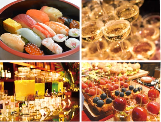 結婚式や二次会で多くのお客様からご好評いただいている、こだわりのビュッフェやドリンクでおもてなし。パーティー開始後から自由に楽しめるので、花火が上がるまでの時間も優雅にお過ごしいただけます。