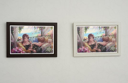 ずっしりとした木枠に収められた美しく輝くガラス製のミラー。ガラス製ミラーの特性に合わせた処理が可能にした、ポートレート写真のような奥行きのある立体的な表現。語らいに潮風と花々が香る、穏やかな安らぎのひととき。心染めるほどの優美な姿を描いた、癒しと彩りに満ちた一枚が完成しました。