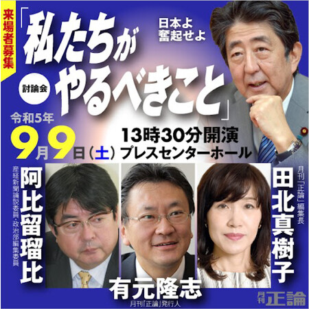 月刊「正論」(産経新聞社発行)は9月9日(土)、昨年7月に銃撃され死亡した安倍晋三元首相の国葬からまもなく1年になるのを前に討論会「日本よ奮起せよ! 私たちがやるべきこと」を開催します。大阪会場で今年7月に開催した際は定員満席となる800人の来場者が訪れ、好評でした。