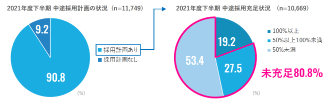 80.8%が採用計画に対して未充足。中途採用が充足した企業は20%を下回る