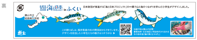2022年夏、小浜市と勝山市で海の恵みや海洋ごみについての体験授業を実施。山を豊かにすることが海を豊かにしてくれるという“つながり”について学びました。学習の成果はオンライン合同発表会にて発表。勝山と小浜、お互いに鯖の名物があることによってさらに意気投合し、記念に鯖をデザインした箸袋を制作することになりました。