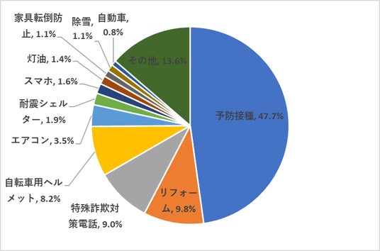 高齢者を対象とした補助金のうち、最も数が多いのはインフルエンザ等の予防接種関係の補助金です。次いで、リフォーム、特殊詐欺対策電話、自転車用ヘルメットの補助金が続きます。エアコンについては全体の3.5%ほどです。