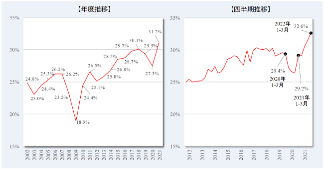 新型コロナウイルスの感染が拡大を始めた2020年1−3月期を起点に大きく水準を切り下げたが、翌年2021年1−3月期には概ね感染拡大前の水準近くに復した。足元2022年1−3月期は、そこから更に伸長を続けており、過去最高値を更新している(当統計の始点である2002年4−6月期以降の最高値)。