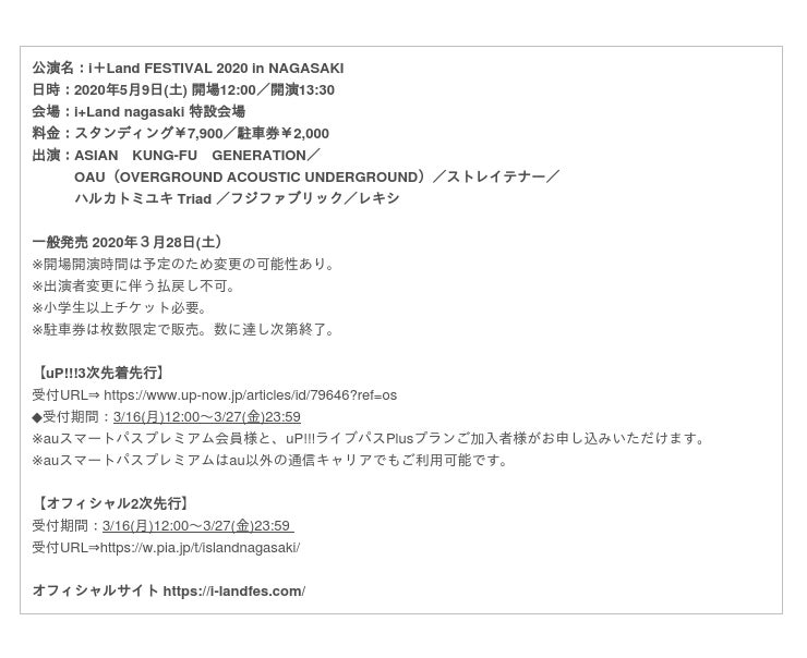 5月9日(土)、長崎県長崎市伊王島・i+Land nagasaki 特設会場に誕生する新しい音楽イベント「i+Land FESTIVAL 2020 in NAGASAKI」。先に発表したOAU(OVERGROUND ACOUSTIC UNDERGROUND)、ストレイテナー、フジファブリックに加え、このたびASIAN KUNG-FU GENERATION、レキシ、ハルカトミユキ Triadの出演が決定。全6組が出揃いました!