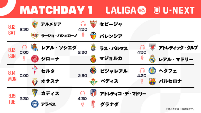 U-NEXTでは8月12日(土)の2023-2024シーズン開幕より、全380試合をフルHD(1080p)で見放題でライブ配信するほか、セビージャ、バスクなど同地域クラブ同士の熱いダービー戦やカップ戦出場権、残留と降格をかけた注目試合を含む約130試合を、日本語実況・解説付きでお届けいたします。