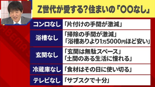 “住まいの中でいらないモノ”について、若者に街頭インタビューを行うと、「片付けの手間が激減するのでコンロ不要」「浴槽はなくても困らない」「その日の分だけを買って使い切るから冷蔵庫はいらない」「テレビがなくてもスマホでいろいろ見られるからそれで十分」と、令和の一人暮らし事情が明らかに。