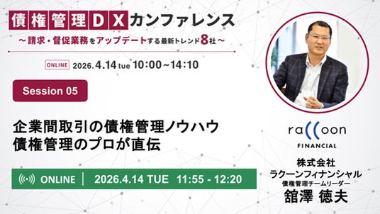 売掛保証サービス「URIHO(ウリホ)」と企業間決済サービス「Paid(ペイド)」を提供する株式会社ラクーンフィナンシャル(本社:東京都中央区、代表取締役社長:秋山 祐二)は、4月14日(火)に開催される、Lecto株式会社(本社:東京都渋谷区、代表取締役:小山 裕)主催、株式会社Everybeyond(本社:東京都世田谷区、代表取締役:馬渡 拓海)運営による「債権管理DXカンファレンス」に登壇します。