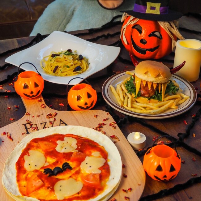 デビルをモチーフにした唐辛子で作った角が特徴的なボリューム満点のベーコンチーズバーガー「デビルバーガー」と、おばけ(ゴースト)をモチーフにしたチーズをトッピングした濃厚なトマトピザ「ゴーストピザ」は子どもから大人まで、味はもちろんのこと見た目まで楽しんでお召し上がりいただけます。