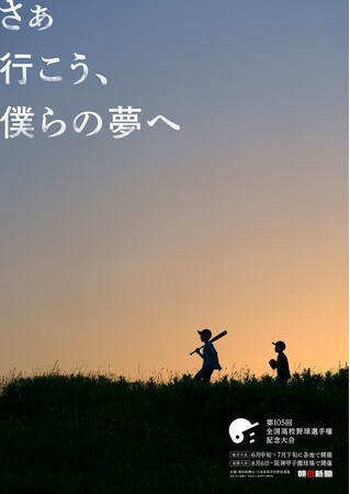 また、第105回記念大会の大会ポスターも完成しました。カメラマンをつとめたのは、元プロ野球選手でバーチャル高校野球のフィールドディレクターでもある斎藤佑樹さんです。子どもにも大人にも、野球に携わっていない人にも心に響く「さぁ行こう、僕らの夢へ」というキャッチフレーズをテーマに、河川敷で暗くなるまで野球の練習をする野球少年の兄弟を被写体として撮影しました。