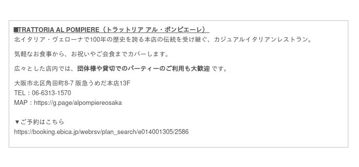 阪急うめだ本店13階「TRATTORIA AL POMPIERE(トラットリア アル・ポンピエーレ)」