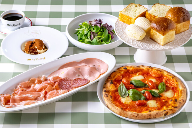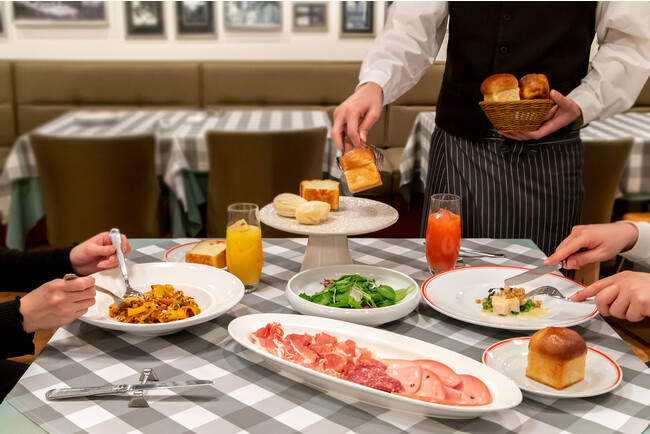 3種のパンはおかわりOK。テラス席も解禁、季節のドルチェも。春のアル・ポンピエーレは華やか盛りだくさんです。