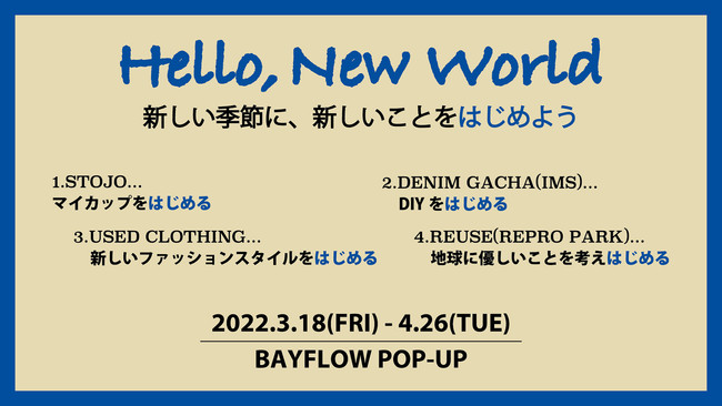 「Play fashion!」をミッションに掲げる株式会社アダストリア(本部:東京都渋谷区渋谷2-21-1、代表取締役会長:福田三千男)が展開するライフスタイルブランド「BAYFLOW(ベイフロー)」は、一部大型店舗にて、“はじめる”をキーワードに新生活に最適なライフスタイルグッズを展開するポップアップ『Hello, New World』を3月18日(金)より展開いたします。