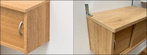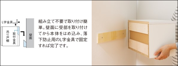 吊り戸棚の構造はディノスで実績のある構造です。壁面(木芯のない石膏ボード部分には取付不可能)に受け部を取り付け、本体をはめ込みます。完成品なので組み立て不要で壁に取り付けるだけです。