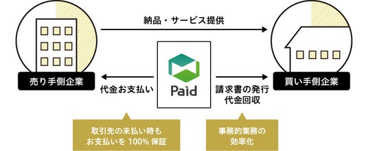 そこでPaidは、売り手側の企業に代わって与信管理から代金回収業務までをすべて代行し、未入金が発生した際はPaidが100%代金をお支払いします。