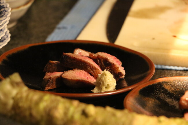 贅沢な「白センマイとウニ」や肉厚のタンのたたきを堪能する5人。