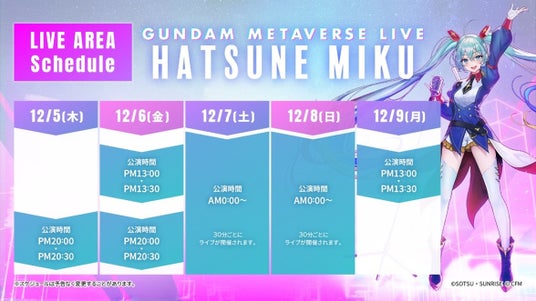 株式会社バンダイナムコエンターテインメントは、2024年12月5日(木)より開催する「ガンダムメタバース 第3回期間限定オープン」で実施する、「初音ミク」とのコラボレーションライブの最新情報を公開いたしました。