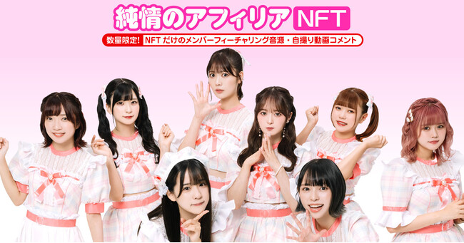 本NFTは、「純情のアフィリア」メンバー8名(渚カオリ、葉山カナ、寺坂ユミ、雨森セラ、桜田アンナ、優希クロエ、東城アミナ、夏目ベール)それぞれのソロNFT。10月25日(火)リリースの、2年半ぶりとなるシングル「LIMITLESS」収録の「LIMITLESS」「うそつき」「Go My Love」を、NFT限定で、各メンバーの、メンバーfeat.音源と自撮り動画コメントがセットになったNFTで計24アイテム、それぞれ先着15点限定の、ここでしか手に入らない内容となっています。