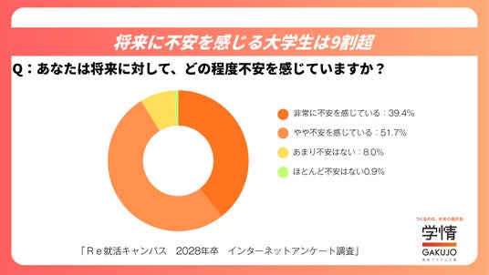 「将来に対して、どの程度不安を感じていますか?」という質問に対し、「非常に不安を感じている」が39.4%、「やや不安を感じている」が51.7%となり、合計で91.1%が将来に不安を感じていると回答しました。一方で、「あまり不安はない」「ほとんど不安はない」と回答した学生は8.9%にとどまり、多くの大学生が将来に対して何らかの不安を抱えていることが分かります。