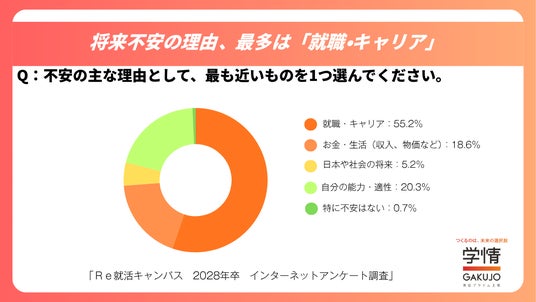 将来への不安を感じている理由について尋ねたところ、最も多かったのは「就職・キャリア」で55.2%でした。次いで、「自分の能力・適性」が20.3%、「お金・生活(収入、物価など)」が18.6%となり、就職・キャリアに対する不安が、他の要因を大きく上回る結果となっています。「どのように就職し、どのようなキャリアを歩んでいくのか」という点が、大学生の将来不安の中心にあることがうかがえます。