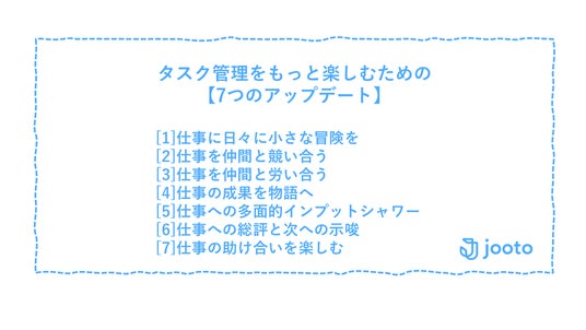 そのために、Jootoが提唱する「仕事の循環モデル」(「一歩目を決める」「進捗が見える」「仕事が進む」「成果が見える」+「行動が起きる」「行動が変わる」「仕事が完了する」「仕事が楽しくなる」)を、よりワクワクする形に進化させる7つの方針を策定し夢として掲げます。
