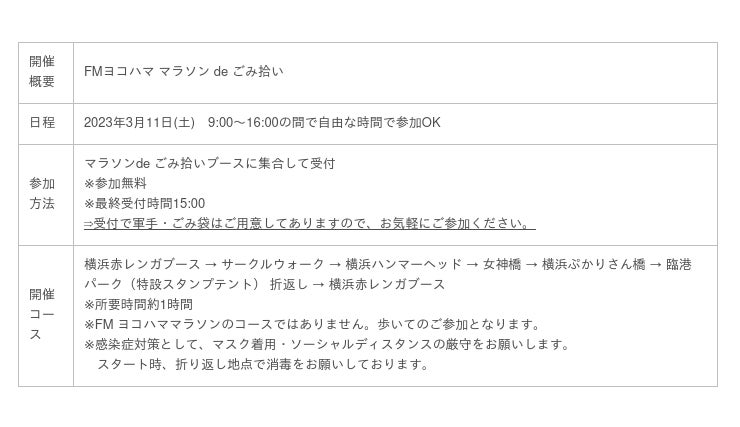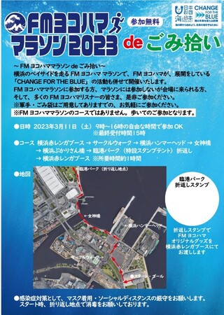 神奈川 守ろう!私達の綺麗な海 実行委員会はFMヨコハマ(84.7MHz)で3月11日(土)に横浜のベイサイドを走る「リストグループ presents FMヨコハマ マラソン2023」でマラソンに参加される方、マラソンに参加しないが会場に来られる方、そして、多くのFMヨコハマリスナーとともに、「FMヨコハマ マラソン deごみ拾い」を開催します。