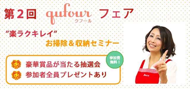 qufourは、従来のWEBによる暮らしの情報提供に加え、家事や子育てに関する工夫をリアル体験できる講座、暮らしを楽しく便利にしてくれる商品のプレゼント、編集部員との交流などが行える場を『qufourフェア』として提供しています。第2回目となる今回は、「"楽ラクキレイ"お掃除&収納セミナー」と題して、家事や子育て、仕事に頑張る女性たちへ、家事と暮らしをもっと楽しくラクにする講座を2本実施、また参加者全員へプレゼントを進呈いたします。