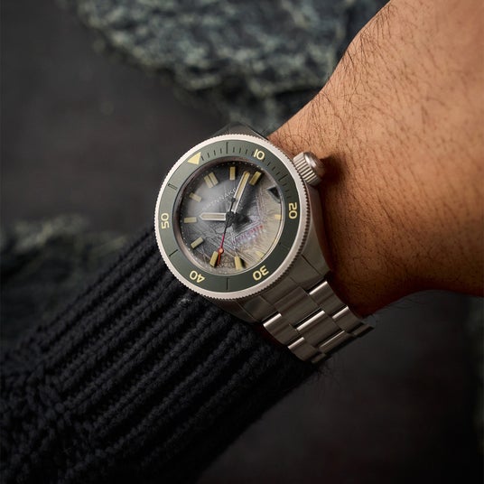 メテオライトの“発見”は運命でした。「ピカール」はスイスの海洋学者ジャック・ピカール氏が乗船した潜水艇にインスパイアされたコレクションであり、“バブルレンズ”とも称されるスーパードーム型サファイアクリスタルレンズは、耐水圧性能に優れた潜水艇の舷窓から着想を得たものです。コレクションに宿る飽くなき探求心がメテオライトにたどり着いたのは、自然な流れでした。