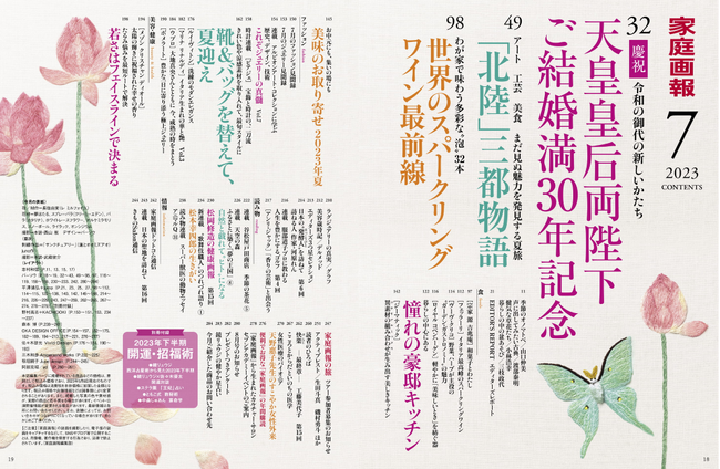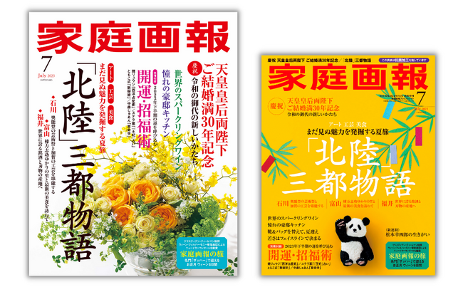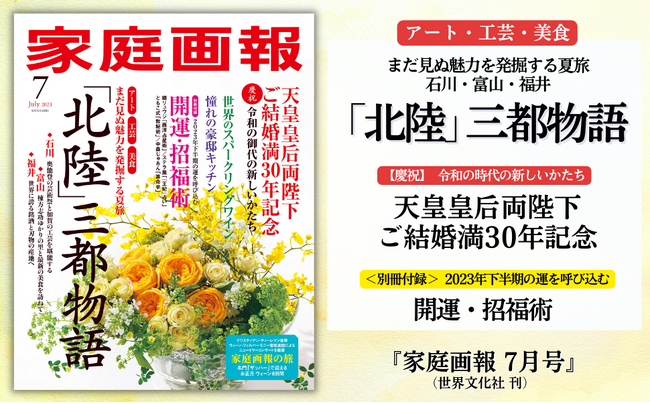 株式会社世界文化社は、『家庭画報 7月号』を6月1日(木)に発売しました。今号では、2024年春に福井まで延伸する北陸新幹線でつながる注目のエリア、石川・富山・福井の北陸三県を大特集。アート、工芸、美食と、そのまだ見ぬ魅力を発掘します。また巻頭特集では、天皇皇后両陛下のご結婚満30年を記念し、令和の御代のご足跡をだどります。