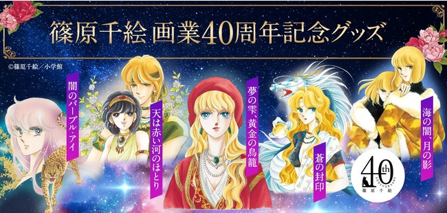 『闇のパープル・アイ』、『天(そら)は赤い河のほとり』など数々のヒット作を持ち、著書の累計は6000万部を超える少女漫画家・篠原千絵氏。昨年12月に迎えた画業40周年を記念し、オンラインショップ「小学館PAL-SHOP」では「篠原千絵画業40周年記念グッズストア」と題し、歴代ヒット作品をフィーチャーしたオリジナル記念グッズを販売中です。
