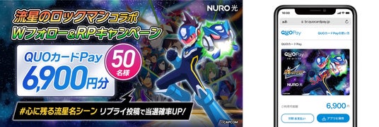 - 内容:期間中、「NURO 光」公式Xアカウント(@NUROhikari_Sony)およびロックマンシリーズ公式Xアカウント(@ROCKMAN_UNITY)をフォローし、キャンペーン対象ポストをリポストすると、抽選で50名に「流星のロックマン」オリジナルデザインのQUOカードPayを “6,900” 円分プレゼント。さらに、ハッシュタグ「#心に残る流星名シーン」をつけて対象ポストにリプライすると、当選確率がアップ。