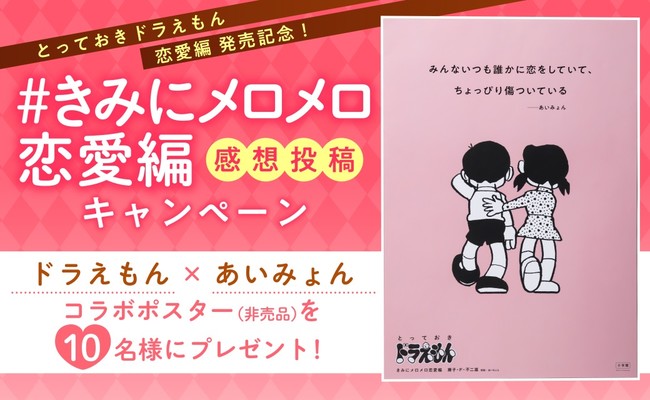 まんが『ドラえもん』の大人気傑作選シリーズ最新刊『とっておきドラえもん きみにメロメロ恋愛編』がいよいよ発売! ドラえもん公式アプリ『ドラえもんチャンネル』では、コミックスの発売を記念して『ドラえもん』の恋愛に関するエピソードを集めた特集を展開中! また、本日2月4日から2月20日まで、ドラえもんとシンガーソングライターのあいみょんさんがコラボしたポスタ-(非売品)が、抽選で10名様に当たるTwitter感想投稿キャンペーンを実施します!