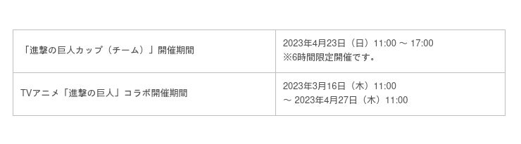 今週末、2023年4月23日(日)には、『ニンジャラ』最強チームを決めるコラボニンジャラ大会「進撃の巨人カップ(チーム)」を全世界同時開催いたします。いつもの仲間たちと一緒に、または、他のプレイヤーとオンラインマッチングでチームを組んでご参加ください。