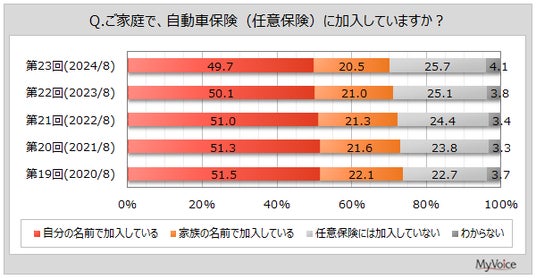 マイボイスコム株式会社(東京都千代田区、代表取締役社長:高井和久)は、23回目となる『自動車保険の利用』に関するインターネット調査を2024年8月1日~7日に実施しました。