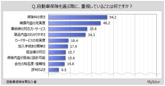 ■自動車保険選定時の重視点は「保険料の安さ」が加入者の約54%、「補償内容の充実度」が5割弱、「事故時の対応力・サービス」「商品内容のわかりやすさ」が各30%台