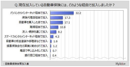 現在加入している自動車保険の加入経路は(複数回答)、「パソコンからインターネット経由」が世帯加入者の32.2%、「保険代理店経由」「自動車を購入した店」が各2割弱です。