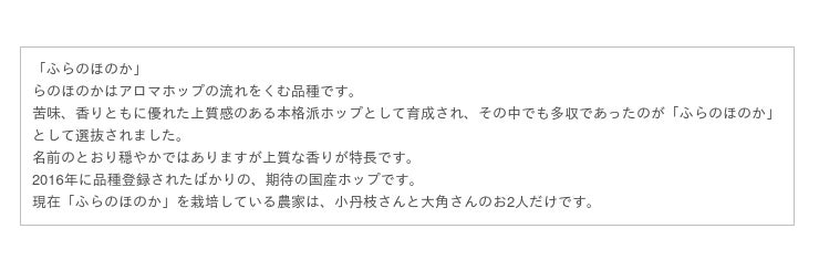 北海道上富良野の小丹枝さん、大角さんの畑で収穫されたホップの新品種「ふらのほのか」を使用し、上質なホップの香りとマイルドな味わい。