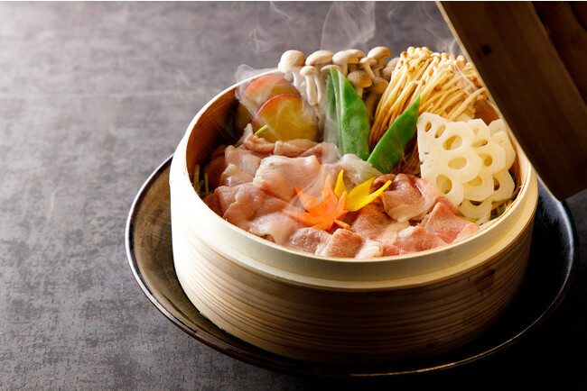 信州牛肉と信州米豚、さつまいも、きのこ、蓮根などの野菜を卓上で蒸し上げます。蒸すことでうま味が凝縮し、肉もふっくら火が通ります。温かな湯気に包まれた旬の味を、蒸ししゃぶ仕立てでさっぱりとお召しあがりいただけます。