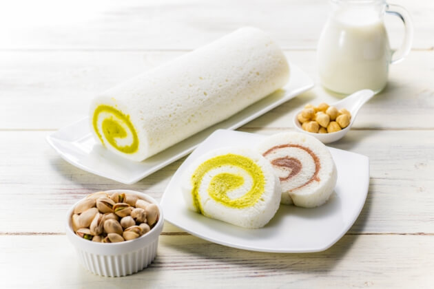 ふわふわスポンジの中に、半分はピスタチオ、半分はヘーゼルナッツのクリームが巻かれているので、1本で2つの味が楽しめます。