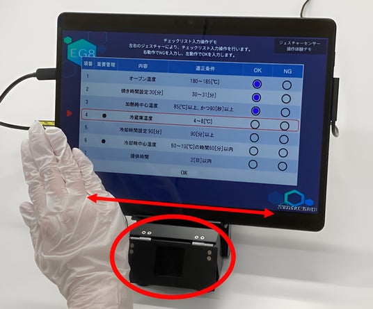 ジェスチャーセンサー非接触で手の動きで画面操作を行います。画面の拡大縮小や、360℃回転、上下左右のスライド操作が可能です。また、数値入力やデータ管理が行えるため、デジタル化やペーパーレス化にも貢献します。