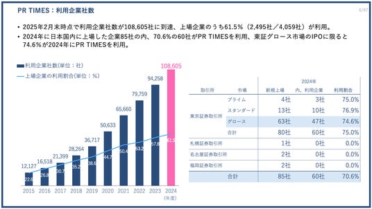 また、2024年に日本国内の証券取引所に新規上場した企業85社の内、60社(70.6%)が「PR TIMES」を利用しています。特に、東証グロース市場への新規上場企業63社の内、47社(74.6%)が2024年に「PR TIMES」を利用しています。