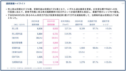 子会社NAVICUSに係るのれん9900万円及び投資有価証券1億1000万円を減損処理して、当期純利益は前期比3.7%減となりました。なお、今回の通期決算より、決算説明資料と決算短信にEBITDAを記載し、今後は営業利益に加えてEBITDAも財務指標として重要視してまいります。