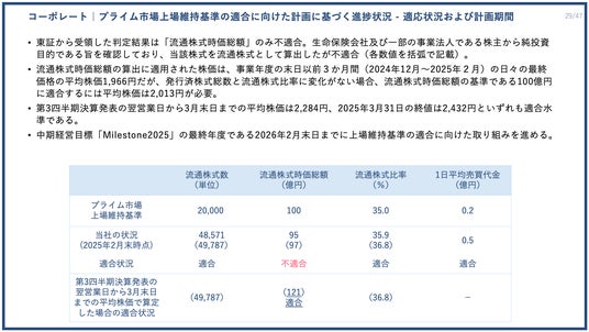 流通株式時価総額の算出に適用された株価は、事業年度の末日以前3か月間(2024年12月~2025年2月)の日々の最終価格の平均株価1966円だが、発行済株式総数と流通株式比率に変化がない場合、流通株式時価総額の基準である100億円に適合するには平均株価は2013円が必要です。第3四半期決算発表の翌営業日から3月末日までの平均株価は2284円で、2025年3月31日の終値は2432円といずれも適合水準となります。