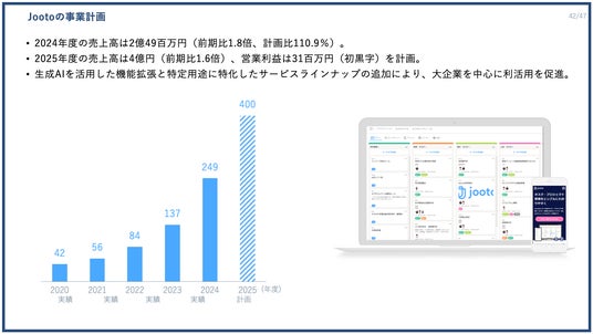 Jootoの事業計画について、2024年度の売上高は2億4900万円(前期比1.8倍、計画比110.9%)となりました。