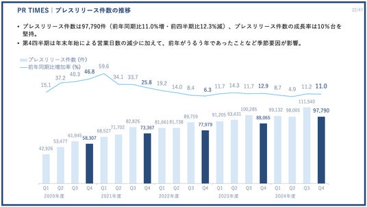 2024年度第4四半期は、9万7790件のプレスリリースを配信いただき、前年同期比で11.0%増、前四半期比で12.3%減となりました。プレスリリース件数の成長率は10%台を堅持しているものの、第4四半期は年末年始による営業日数の減少に加えて、前年がうるう年であったことなど季節要因が影響した結果となりました。